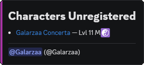 Shows a message when a user unregisters a character in the same world the server is tracking. Ownership changes can also generate unregister messages for the previous owner.